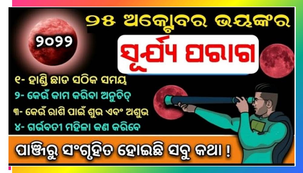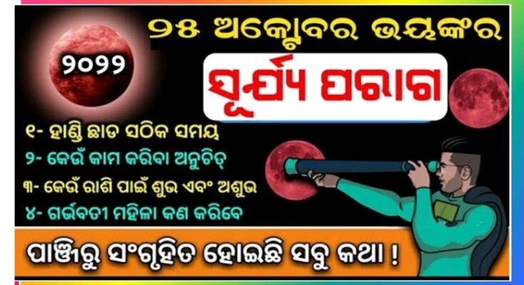 ବନ୍ଧୁଗଣ 25ଅକ୍ଟୋବର କୁ ଲାଗିବାକୁ ଯାଉଥିବା ଏହି ସୂର୍ଯ୍ୟ ପରାଗ ଏ ବର୍ଷର ଦ୍ୱିତୀୟ ହେବ | ଏହି ପରାଗ ଭାରତ ସମେତ ଇଉରୋପ ର କିଛି ଭାଗ ଏବଂ ଏସିଆର ଦକ୍ଷିଣ ପଶ୍ଚିମ ଭାଗ, ଆଫ୍ରିକା ମହାଦୀପ ର ଉତ୍ତର ପୂର୍ବ ଭାଗ ଏବଂ ଆଣ୍ଟାଟିକା ରେ ଦେଖାଯିବ |ସୂର୍ଯ୍ୟ ପରାଗ ର ସମ୍ପୂର୍ଣ ସମୟ ସୀମା 4ଘଣ୍ଟା 15ମିନିଟ ହେବ | ଏହାର ଆରମ୍ଭ 25 ଅକ୍ଟୋବର ଦିନ 2 ଟା ବାଜି 29 ମିନିଟ ରେ ହେବ ଏବଂ ସମାପନ 6 ଟା ବାଜି 32 ମିନିଟ ରେ ହେବ |